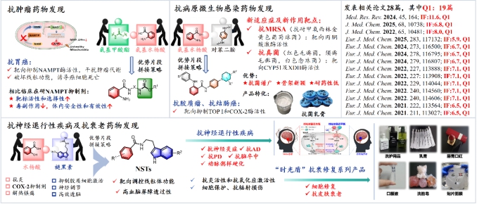 南华大学药物设计与研发团队长期致力于基于片段的药物分子设计,以邻氨基苯甲酰为母核,融合具有良好成药性和明确定义靶点的药效片段,围绕肿瘤、病原微生物感染及神经退行性等重大疾病,发现了多个具备临床开发价值的抗真菌/细菌、抗胃癌、抗线粒体损伤相关性疾病的候选药物。目前,该团队正积极推进科技成果转化,依托自主成立的衡阳泽岐生物医药有限公司,在A轮融资的支持下完成了抗菌乳膏、修复面膜、抗菌日化品等多个品种的初步工艺研究,未来将开展下一轮的项目融资,全力推进产品落地应用。