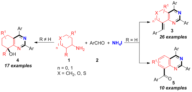 在此基础上,团队进一步将该策略拓展至环状脂肪伯胺体系,在无金属条件下,利用环状脂肪伯胺、醛与碘化铵为原料,通过脂肪伯胺的氧化环化与β-C(sp³)-H官能团化反应,成功实现了多种半饱和稠合嘧啶类化合物的选择性合成。更重要的是,在I2/DMSO/O2氧化体系下,该反应可“一锅”直接转化为喹唑啉类衍生物,无需中间体的分离,显著提升了合成效率。该方法为重要的半饱和稠合嘧啶与喹唑啉类优势骨架提供了简单高效、环境友好的合成新方法。相关成果发表于《Organic Chemistry Frontiers》(中科院二区,IF=4.7),论文第一作者为药学院硕士研究生刘康,通讯作者为湘潭大学化学学院邓国军教授、南华大学药学院王震教授和陈劲进博士,南华大学药学院为第一通讯单位。