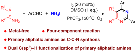 针对这一挑战,南华大学药学院陈劲进博士/王震教授团队近期取得了系统性研究进展。团队开发了一种碘促进的,链状脂肪伯胺、芳香醛和碘化铵四组分反应,高效构建多取代嘧啶类化合物的新方法。该反应创新性地以脂肪伯胺作为C-C-N合成子,芳香醛作为C1合成子,碘化铵作为环境友好的氮源,在“一锅”中实现了脂肪伯胺的α-C(sp3)-H和β-C(sp3)-H键官能化。该方法为具有重要生物活性的多取代嘧啶类化合物的合成提供了简洁、高效的新途径。相关成果发表于《Organic & Biomolecular Chemistry》(IF=2.7,中科院3区),论文第一作者为药学院硕士研究生刘康,通讯作者为药学院彭颖博士、王震教授和陈劲进博士。