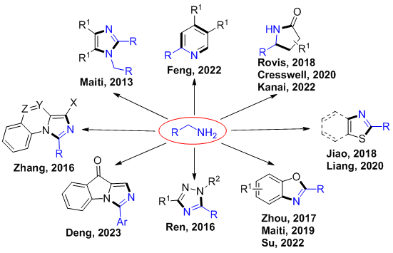 氧化环化是构建重要的碳环和杂环体系,尤其是多环体系的高效策略之一。近年来,基于脂肪伯胺α-C(sp3)-H官能团化的氧化环化反应已成功实现了咪唑,三唑,苯并恶唑,噻唑,苯并噻唑和γ-内酰胺等多种重要氮杂环的高效构建。然而,相对于活化的α-C(sp3)-H键,实现更具挑战性的β-C(sp³)-H键官能团化,并以此构建结构多样的含氮杂环,仍是该领域亟待解决的关键科学问题。
