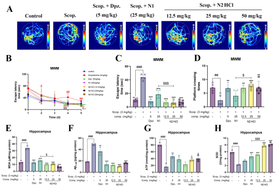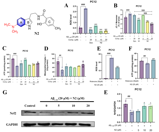 化合物N2是NSTs中筛选出的最优化合物,我们以AD(第一大神经退行性疾病)为切入点进行分子机制探索。结果表明,化合物N2可上调Nrf2并恢复MCI活性以改善线粒体功能从而治疗AD。在细胞水平上,化合物N2不仅能直接改善线粒体功能——表现为显著提升MCI活性、恢复线粒体膜电位并增加ATP生成,还能降低细胞内ROS、炎症因子TNF-α和IL-6水平,有效缓解线粒体功能障碍引发的氧化应激和神经炎症。值得注意的是,机制研究发现化合物N2可逆转鱼藤酮诱导的MCI功能障碍——减少ROS水平并增加ATP生成,同时表现出对Nrf2蛋白表达的上调作用。在AD动物模型中,化合物N2能显著改善小鼠焦虑情绪和认知障碍,并具有调节东莨菪碱诱导的脑组织神经炎症、氧化应激(MDA降低,SOD活性提升)和能量代谢(ATP生成增加)的能力,同时还能减轻Aβ病理蛋白沉积和神经元损伤。上述结果表明化合物N2具备靶向线粒体功能障碍治疗AD的候选药物潜力,揭示了NSTs治疗NDDs的根本机制在于调控线粒体功能,进一步证实了干预线粒体功能是实现多种NDDs治疗的关键途径。研究结果已发表于ACS Omega (IF = 4.3)。本论文第一作者为南华大学药学院硕士研究生曾晶和基础医学院博士研究生赵雨婷。