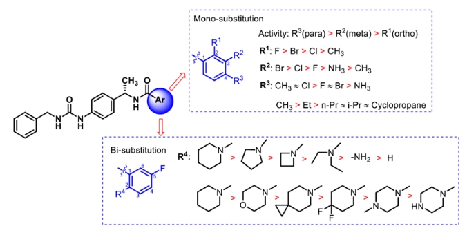 基于前期解析的蛋白-配体结合模式,本研究围绕NAMPT催化口袋关键相互作用位点,理性设计并合成了29个对位脲基苄胺(para-ureidobenzylamine)衍生物。通过系统整合酶学抑制数据与细胞活性结果,较为完整地建立了该骨架体系的SAR模型。研究表明,末端苯环单取代模式显著影响活性,整体趋势为para(R3)> meta(R2)> ortho(R1):邻位仅能容忍极小取代基,间位偏好中等体积吸电子卤素,对位则对立体与疏水效应高度敏感,小型疏水基团表现最佳。同时,在5-氟取代邻氨基苯甲酰胺系列中,邻氨基的衍生化对于活性提升具有决定性意义,呈现明显的“环尺寸依赖”特征,六元含氮杂环(尤其哌啶)显著优于四元环和极性更强的杂环体系,提示适度柔性、合理电子供给能力及稳定质子化状态有利于与NAMPT结合口袋形成优化相互作用。上述结果从空间位阻、电子效应与构象适配三个层面系统阐明了该类NAMPT抑制剂的结构偏好规律。