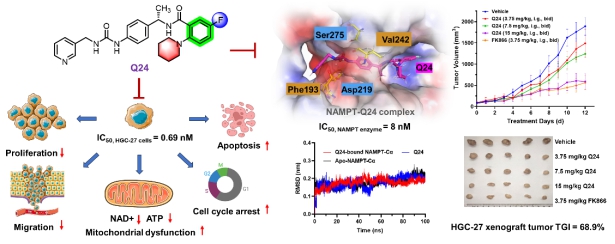 在29个候选分子中,化合物Q24表现出最优综合性能,对NAMPT呈纳摩尔级抑制活性,对HGC-27细胞显示亚纳摩尔级抗增殖效应,分子对接与分子动力学模拟支持其稳定结合模式。体外实验表明,Q24在抑制细胞增殖与迁移、耗竭NAD⁺/ATP水平、阻滞细胞周期及诱导凋亡等方面均优于先导化合物9a;在体内异种移植瘤模型中,其肿瘤抑制率达68.9%,且未见明显组织病理学异常,同时具备良好的口服药代动力学特征与系统耐受性。值得注意的是,未取代末端苯环的Q20在肝微粒体代谢稳定性方面表现突出,为活性与代谢稳定性的平衡优化提供了重要参考。该成果标志着团队在NAMPT靶向抗肿瘤小分子研究领域实现由“活性发现”向“理性构效调控”的阶段性跃升,为后续成药性优化和临床前开发奠定了坚实的分子设计基础。