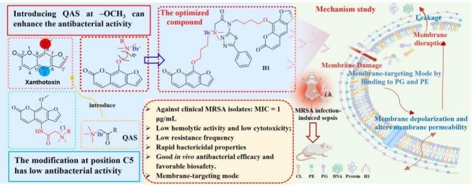 耐甲氧西林金黄色葡萄球菌(MRSA)是临床上常见且毒性较强的耐药细菌之一,已对广泛使用的抗生素耐药,因此被称为超级细菌。针对这一挑战,团队聚焦天然产物衍生化,分别以天然产物吴茱萸次碱和花椒毒素为先导骨架,发展出两类具有代表性的抗MRSA候选分子,表现出高效、低毒和机制创新等特点。