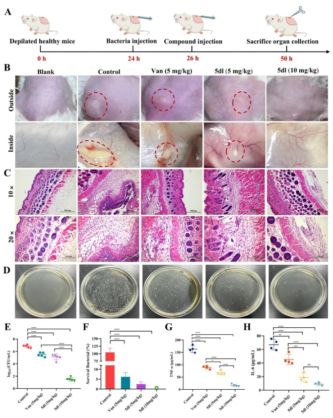 在体内实验中,5dl展现出优异的抗感染能力。在小鼠MRSA皮肤脓肿模型和脓毒症模型中,均表现出显著治疗效果,整体疗效优于万古霉素。药代动力学研究进一步表明,5dl具有较广泛的组织分布能力并具备系统治疗潜力。结合其快速杀菌、高效体外活性、较低毒性以及良好的血浆稳定性,5dl显示出优异的开发潜力。