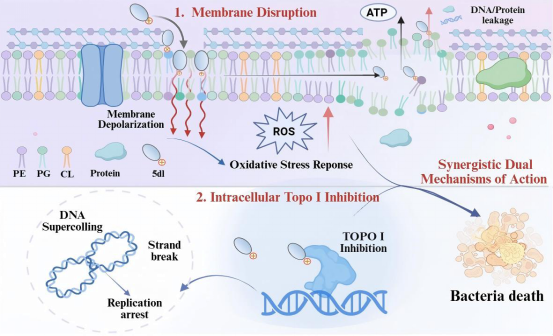 研究表明,5dl对10株MRSA临床分离株的最低抑菌浓度(MIC)低至0.5–2 μg/mL,优于临床一线药物万古霉素。且5dl具有快速杀菌、低耐药诱导倾向、低毒性和良好血浆稳定性;进一步机制研究揭示,5dl并非依赖单一靶点发挥作用,而是通过膜靶向破坏与胞内酶抑制协同实现高效杀菌。一方面,5dl能显著扰乱细菌细胞膜稳态,诱导膜去极化、膜通透性升高,并造成胞内物质外泄和细菌快速死亡;另一方面,5dl还能选择性抑制细菌DNA TopoI活性,干扰DNA超螺旋调控,阻断DNA复制与转录过程,从而形成“双重打击”的抗菌模式。