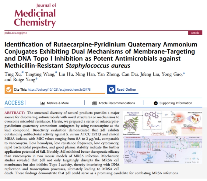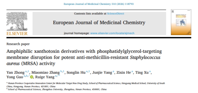 近日,南华大学药学院郭勇和杨瑞阁教授团队围绕耐甲氧西林金黄色葡萄球菌(MRSA)感染治疗,基于天然产物骨架开展系统药物创制研究,连续取得两项重要进展。相关成果分别发表于Journal of Medicinal Chemistry和European Journal of Medicinal Chemistry,为抗多重耐药菌感染药物研发提供了新的分子骨架和思路。