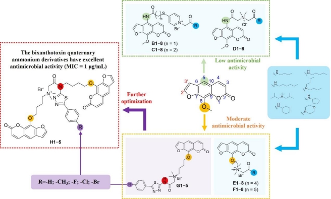 此外,团队基于天然产物花椒毒素(xanthotoxin)骨架进行系统结构优化,采用“天然产物-阳离子模块”杂化策略,对其不同修饰位点开展构效关系研究,共设计合成50个衍生物。