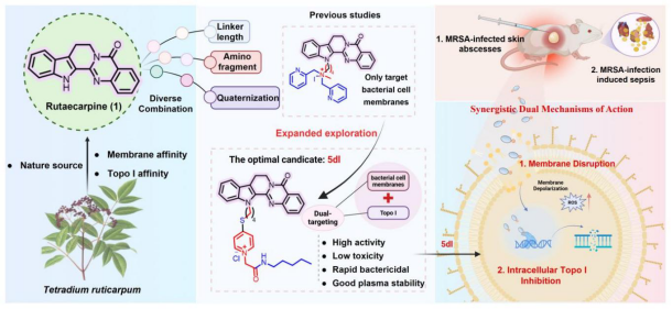 在发表于Journal of Medicinal Chemistry(https://doi.org/10.1021/acs.jmedchem.5c03478,中科院医学1区,Top期刊,IF = 6.8)的研究中,团队以天然产物吴茱萸次碱为母核,在保留其核心骨架和柔性连接链的基础上,引入吡啶季铵盐亲水头基,设计合成了系列吴茱萸次碱-吡啶季铵盐衍生物,最终筛选得到兼具膜靶向破坏与DNA拓扑异构酶I(Topo I)抑制的双机制抗菌先导5dl。