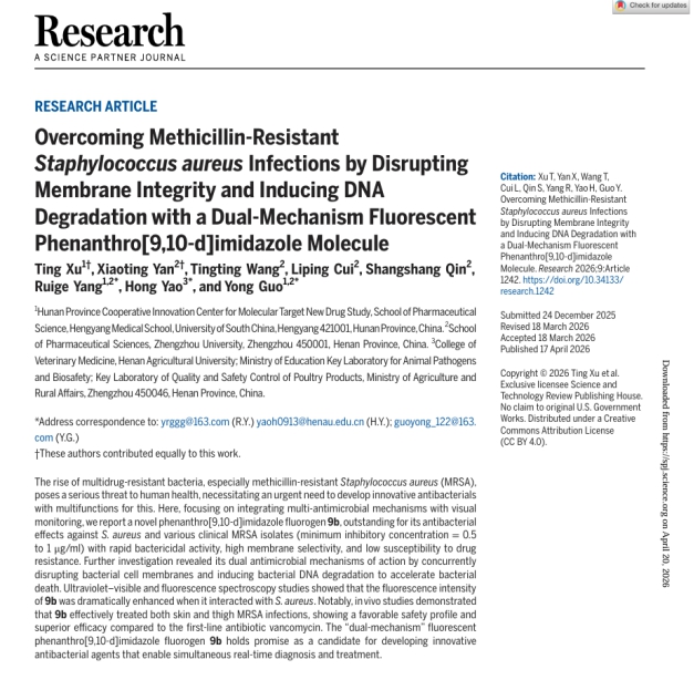 南华大学药学院杨瑞阁和郭勇教授团队联合河南农业大学动物医学院姚红教授,在治疗临床MRSA感染药物先导发现方面取得新进展。团队聚焦临床棘手的耐甲氧西林金黄色葡萄球菌(MRSA)感染治疗难题,以新型荧光抗菌骨架类天然产物菲并咪唑为核心,成功开发出兼具高效抗菌活性与动态荧光示踪功能的抗菌先导分子,为感染诊疗一体化提供全新策略。相关研究结果发表于权威期刊《Research》(中国科学技术协会(CAST)与美国科学促进会(AAAS)联合创办,中科院综合类大类1区Top,IF2025=10.9)上,论文链接:https://doi.org/10.34133/research.1242。