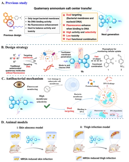 MRSA 作为典型的“超级细菌”,其感染已成为威胁全球公共卫生的重要问题。伴随传统抗菌药物疗效衰减、细菌耐药性日趋严峻,研发兼具高效抗菌、低耐药风险、可荧光可视化监测的新型抗菌分子,对实现感染精准诊断、疗效实时评估与个体化用药具有重要价值。团队前期已系统开展菲并咪唑季铵盐类化合物研究,证实其兼具荧光特性与抗菌活性,研究结果发表于药物化学权威期刊(10.1021/acs.jmedchem.4c00436,中科院医学类1区Top)。在此基础上,团队通过季铵盐中心移位、高共轭疏水骨架构建、长烷基链修饰等策略,进一步优化分子抗菌效能、生物安全性与荧光示踪性能,成功筛选获得优势先导化合物9b。体外评价显示,9b对标准金黄色葡萄球菌及多株临床MRSA分离株均展现卓越抗菌活性,MIC值低至0.5–1 μg/mL,抗菌效力与临床一线药物万古霉素相当;同时具备快速杀菌、低耐药诱导、高膜选择性、低溶血性等优良成药特征。值得一提的是,9b与细菌结合后荧光信号显著增强,可实现抗菌全过程可视化监测,展现出优异的诊疗一体化应用潜力。
