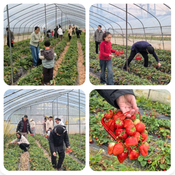 中午,享用过当地农家特色菜肴,简短的休整过后,大家前往附近的草莓园开启欢乐、愉快的草莓园参观采摘之旅,在大棚种植区,香草、巧克力、丹东奶油、奶香各色草莓一应俱全,老师们近距离观察、品尝,欢声笑语充满了整个园区。